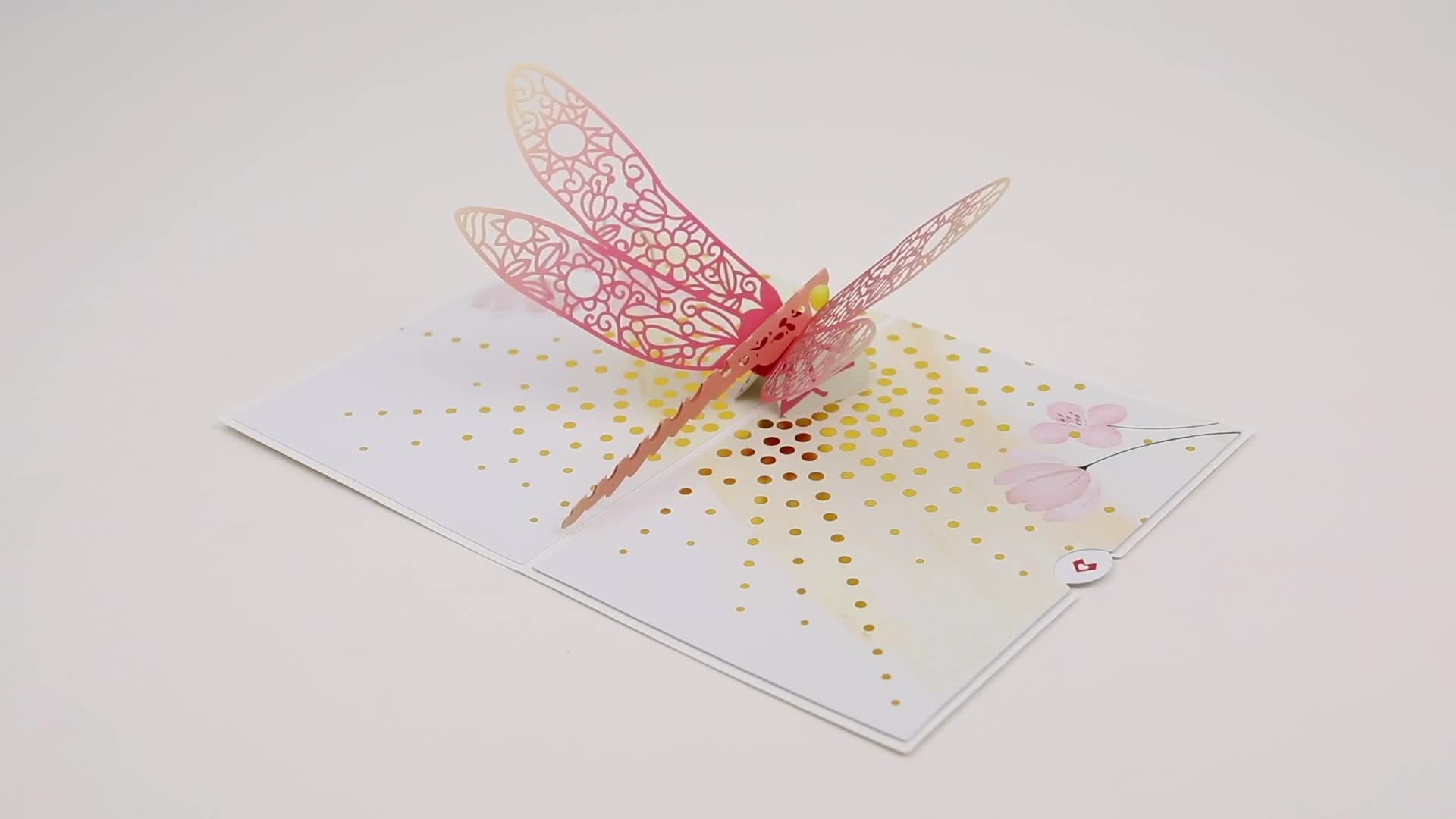 The Mother’s Day Dragonfly pop-up card is 5 inches wide by 7 inches tall.