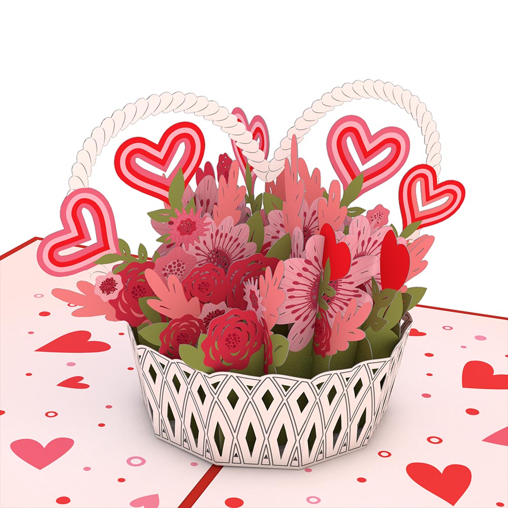 This vivid scarlet greeting card displays the words 'Happy Valentine's Day' in charming white script, decorated with cute hearts and polka dots. Inside this pop-up card, a gorgeous floral bouquet pops out. A beautiful white basket, its handle in the shape of a heart, holds a bunch of red roses and pink blossoms on leafy green stems and adorable, heart-shaped adornments. The rosy background dazzles with even more pink and red hearts and confetti.