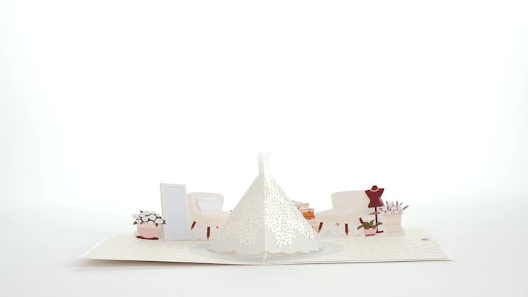 The front of this beautiful Wedding Card features an elegant 'Congratulations!' message in gold cursive and a simple dress design. The dress comes to life when you open the card, as a pop-up version fills the room. Two pink loveseats and potted flowers surround the lacy 3D white gown, alongside a mirror propped up against the wall and other elements reminiscent of a bridal suite.