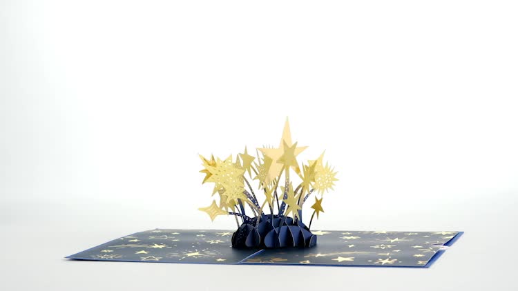 The cover of this sparkling card is dark blue and speckled with shimmery and twinkling gold and yellow stars. The message "You're a star" is written on the front in an elegant font. Once opened, a vibrant 3D explosion of more gold and yellow stars pops out against a dark colored background, patterned with more glimmering falling stars, shooting stars, and various sparkling celestial suns. This card shows joy, celebration, beauty, and the wonder of the cosmos all in one firework burst of intricate paper.