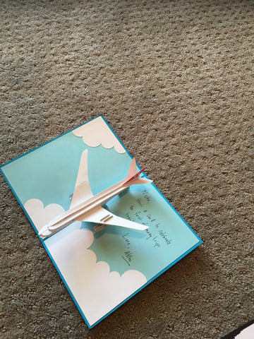 On their flight to Hong Kong, she noticed an envelope on her seat. Inside was an Airplane Lovepop with a sweet note: "Nisha, Here's a card to celebrate the first of many trips together. Love, Abhi"