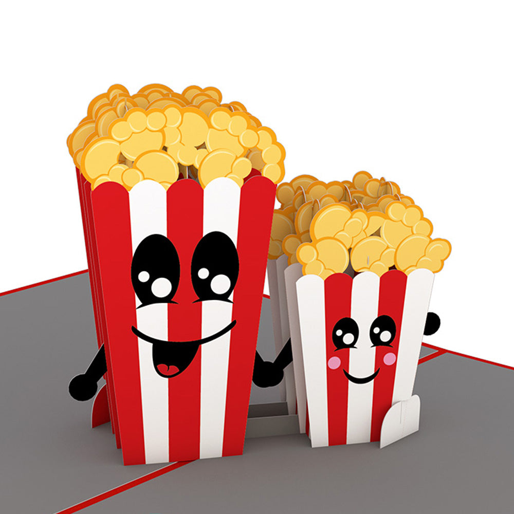 Kernels of freshly popped popcorn bounce on the bright red cover of this 3D card, inviting you to check inside for the second half of a clever phrase in white lettering. When you open the card, a pair of adorable popcorn characters hold hands and wave, with kernels of popcorn dancing across the dark gray background. The phrase continues on the inside of the card, completing a sweet salutation.