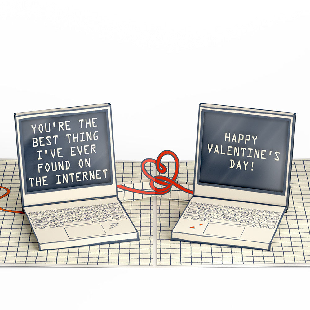 Description: Show them your love this Valentine’s Day with this clever pop-up card. Inside, two laptops pop up with heartfelt messages: "You're the best thing I've ever found on the internet" and "Happy Valentine's Day!" A playful ode to any relationship that started on a dating website or app, this is the perfect way to celebrate your online connection this Valentine’s Day.
