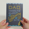 Description: Wish him a legendary Father’s Day with this mythical-themed pop-up card featuring the message "Dad, thanks for always believing in me" on the cover. Inside, a majestic Loch Ness-style sea creature emerges from the water, holding a "#1 You're a Legend" shield—making it the perfect greeting card for a dad who is legendary in your eyes.