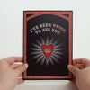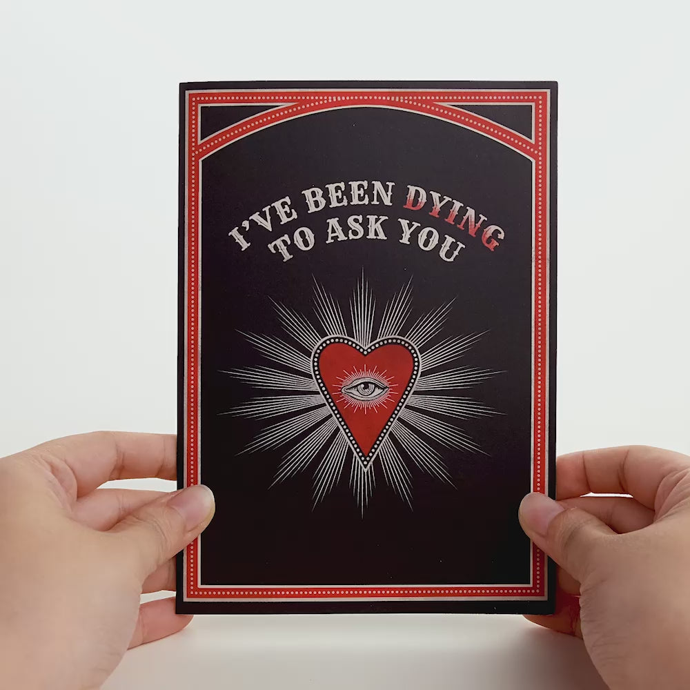 Description: Ask them to be your valentine with this mysterious and gothic Valentine's Day pop-up card. The cover of this greeting card features a dramatic black and red design with the phrase "I've Been Dying to Ask You" and an all-seeing eye in a heart. Inside, a spirit board-inspired layout asks, "Will you be my Valentine?" Give this card to your partner, spouse or those who love a darkly romantic aesthetic.