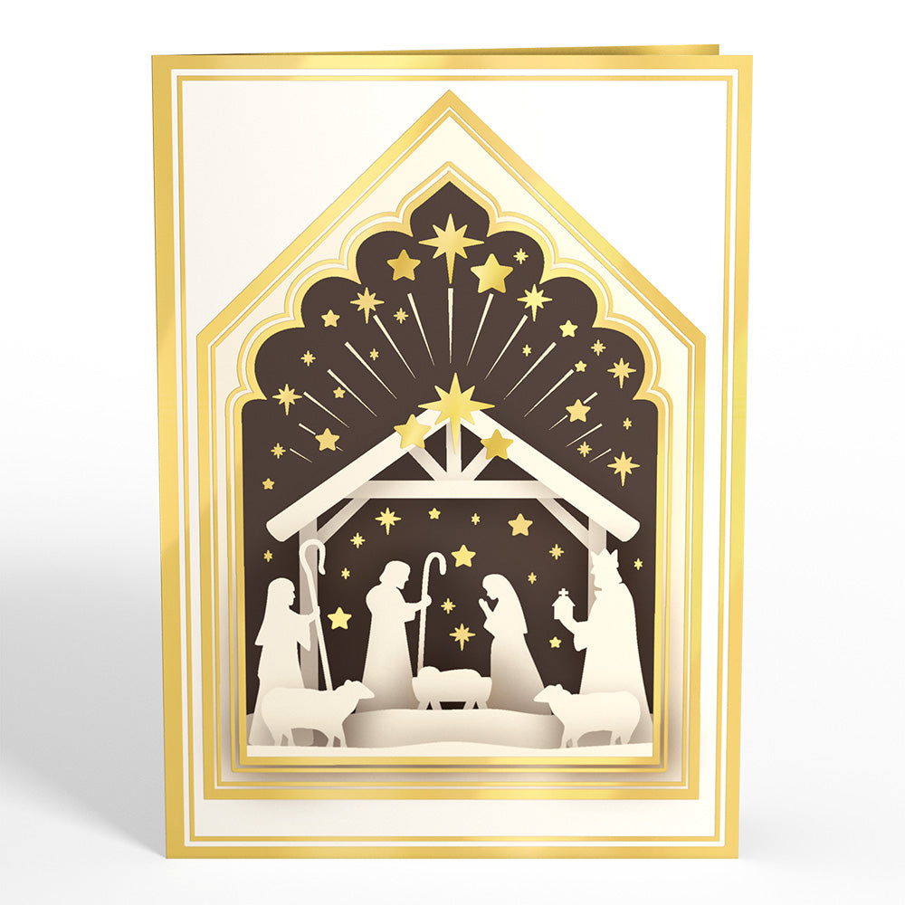Description: Celebrate the true spirit of the season when you gift this nativity pop-up card designed in elegant shades of winter white to your Christian loved ones. Share this religious Christmas card with family, friends, church members, and neighbors to commemorate the birth of Jesus.