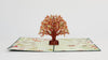 The forest green front cover of this pop-up card showcases a branch of dainty leaves in fall colors, including deep purple and shades of orange. Upon opening the card, an impressive tree shoots up in 3D, stretching out its branches that are lush with orange, green, and red leaves. Woodland animals peek out among the tree's branches, such as wide-eyed owls and chirping birds. A sturdy brown trunk holds up the display. The inside cover is pale green and features more forest leaves and plants in various autumn shades and a sweet orange fox investigating the tree at its base.