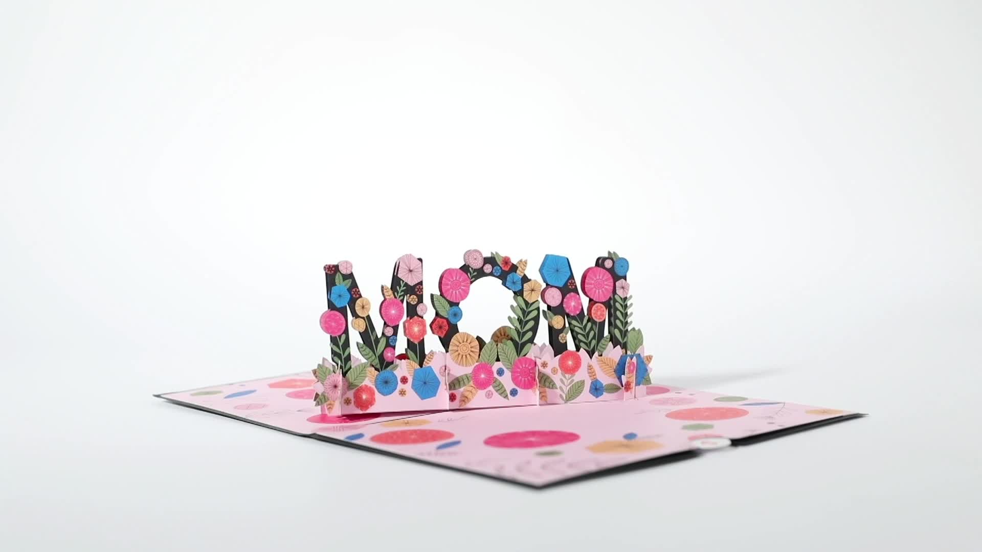 Colorful flowers in front of a black background make up this pop-up card that lets you show the mother in your life how grateful you are for them. When you open up this card, you're greeted with a colorful display of flowers with green leafy details. Summery orange, vibrant blue, and delicate pink colors all come together to provide a whimsical and fun scene.