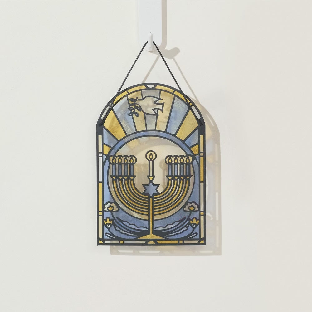 Send a little sunshine with our collection of Suncatcher Cards! These beautifully crafted greeting cards open to reveal a special surprise — a removable suncatcher gift. Made of colored transparent acetate, the suncatcher comes complete with a string for hanging. Position in a window to admire the colorful shadows it throws when hit by light, creating a mesmerizing display! Perfect for celebrating Hanukkah with your family, friends, and other Jewish loved ones, this unique combination of card and gift will brighten anyone's day.