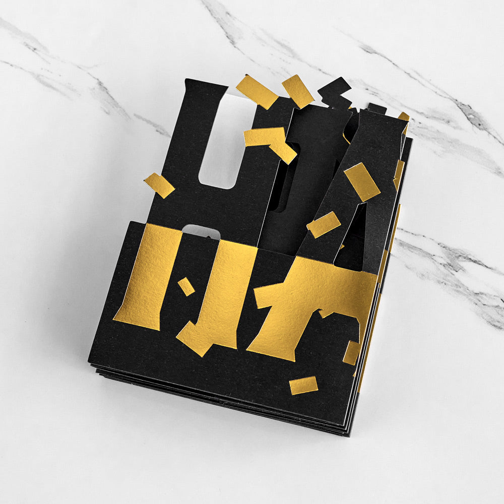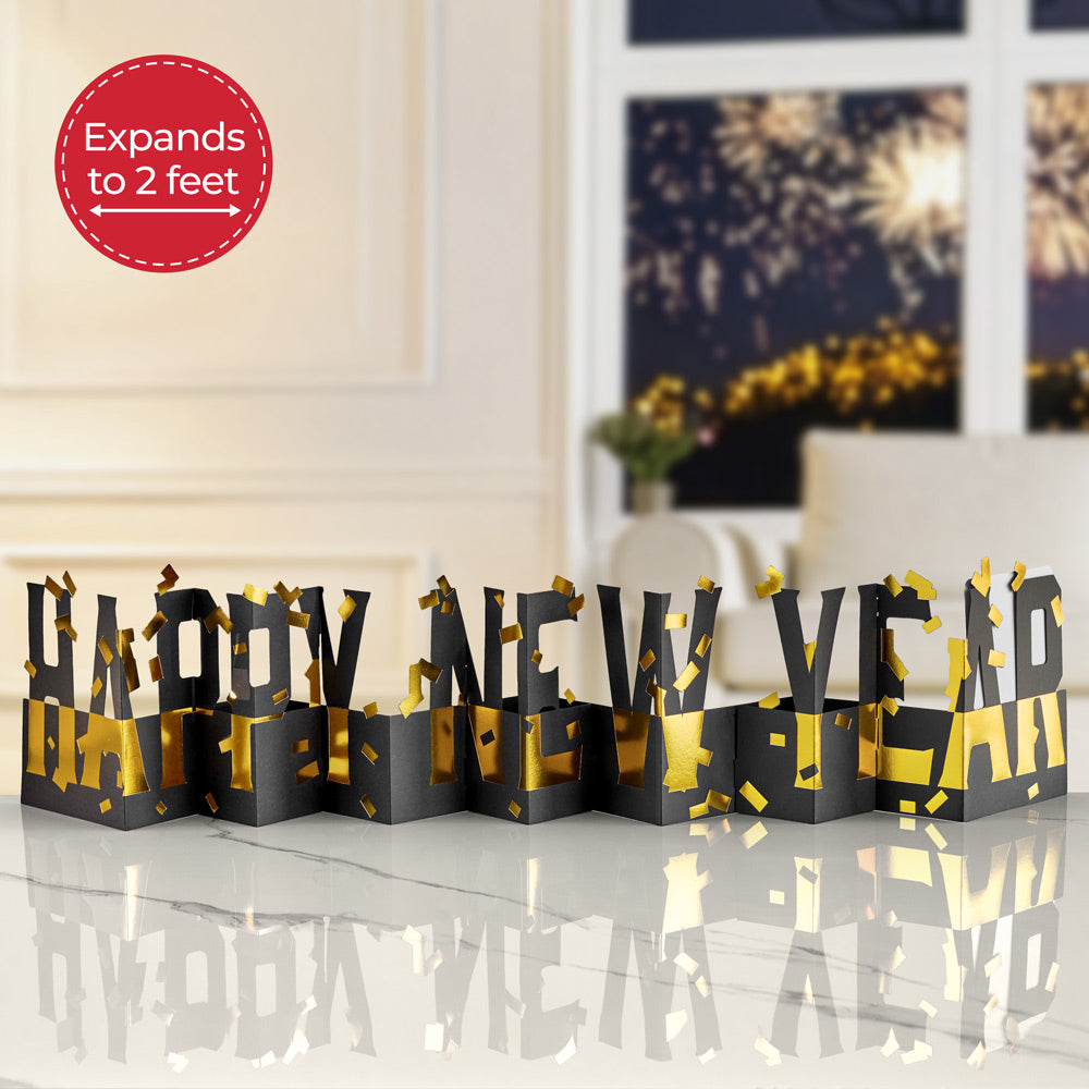 This expandable greeting card celebrates the New Year in bold style. When opened, it unfolds into a 3D black and gold display, spelling out “HAPPY NEW YEAR.” Perfect as both a greeting and a party decoration, this accordion-style greeting card makes a dazzling statement and is ideal for sharing excitement and joy as the new year begins.