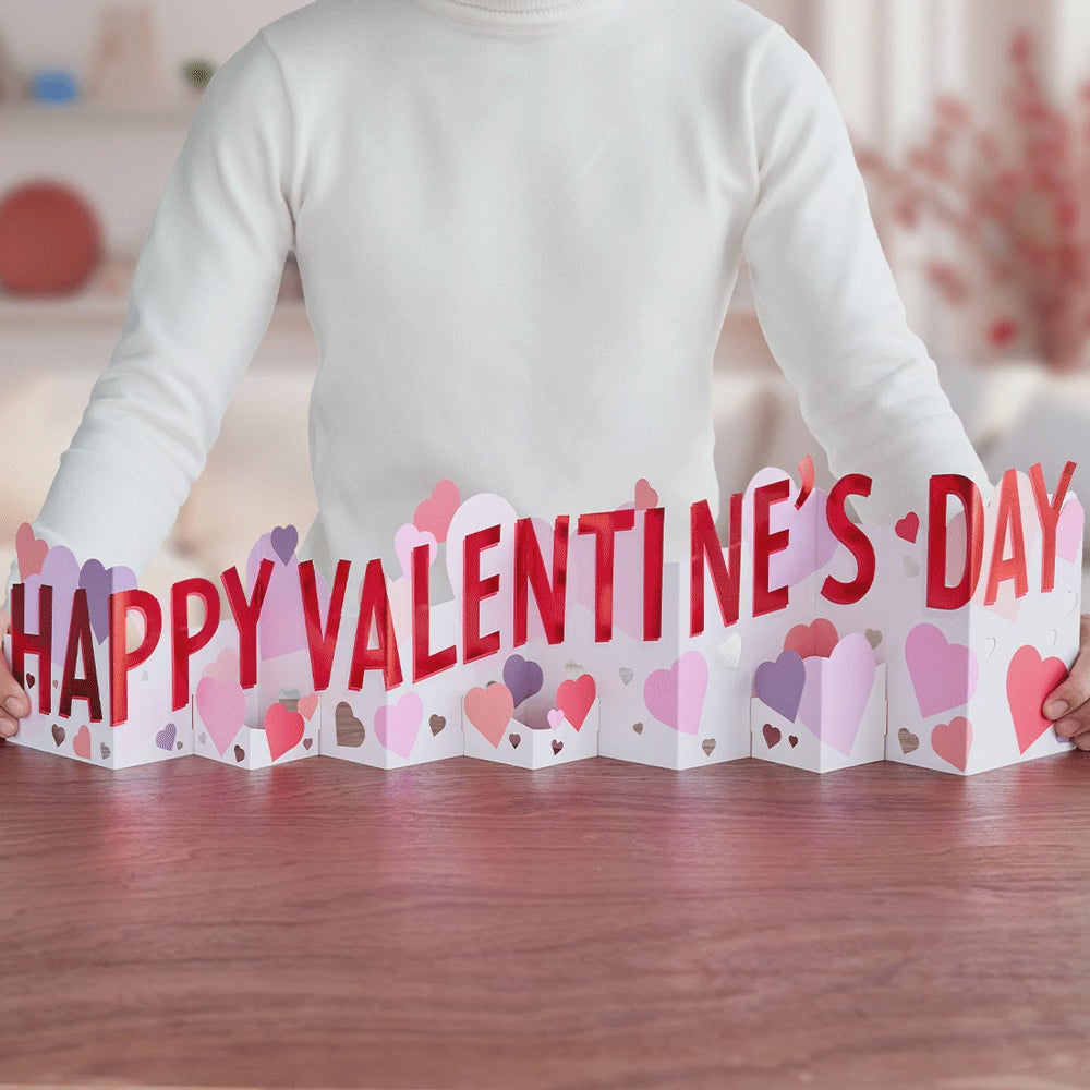 This eye-catching expandable pop-up card boldly displays "Happy Valentine's Day" in large red letters, surrounded by a vibrant array of hearts in shades of pink, purple, and red. The accordion-style design creates a striking 3D effect, making it a perfect centerpiece for a heartfelt Valentine's Day greeting.