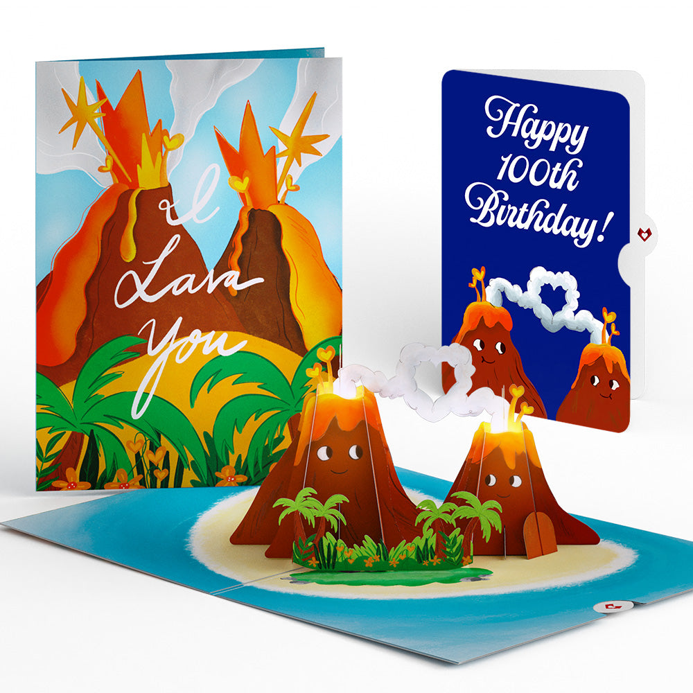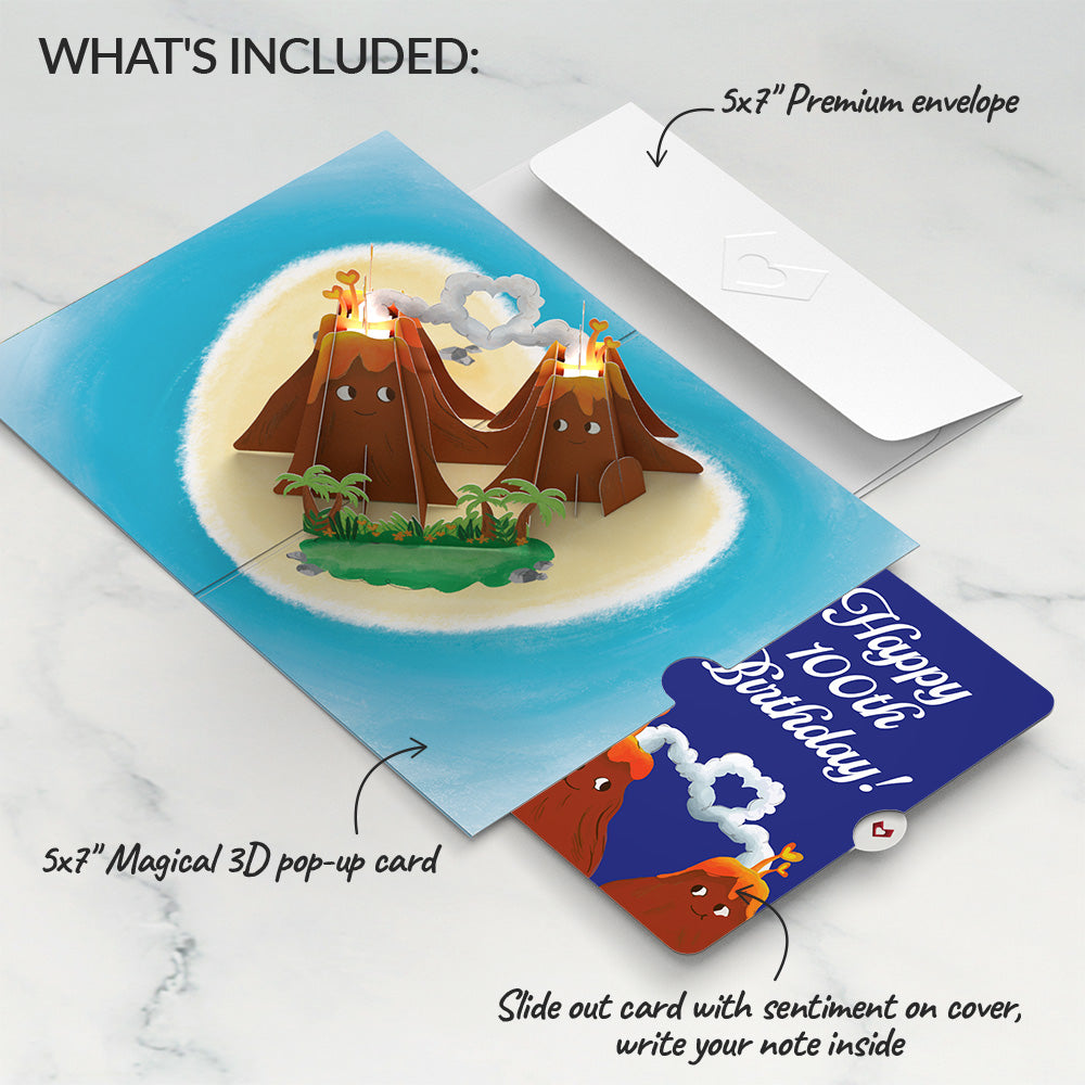Celebrate a century of warmth, joy, and unforgettable moments with this glowing volcano-themed birthday card! Bursting with love, tropical flair, and playful charm, this light-up pop-up card makes 100 years feel bright and full of life. Featuring: