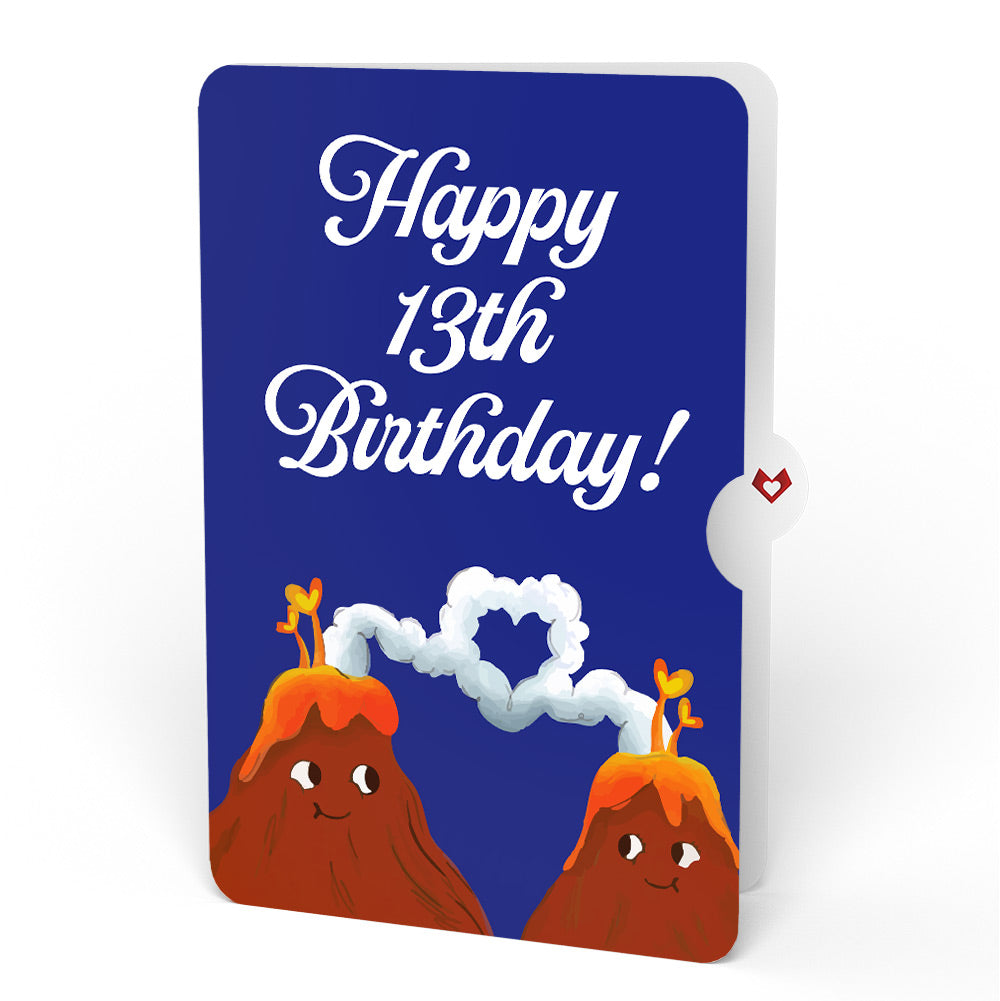 2. Special Sentiment: The coordinating card features a bright blue background and cheerful text that reads “Happy 13th Birthday!” With cute volcano artwork and a puff of heart-shaped smoke, this message is playful, age-perfect, and filled with lighthearted joy.
