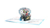 On the cover of this galactic birthday card, Groot stands ready to plug his music into a large speaker above an “It’s your birthday!” message. Upon opening, the Guardians of the Galaxy pop-up in 3D surrounded by music notes. The same music notes decorate the blue inner panels, along with the message “Party galactically!”