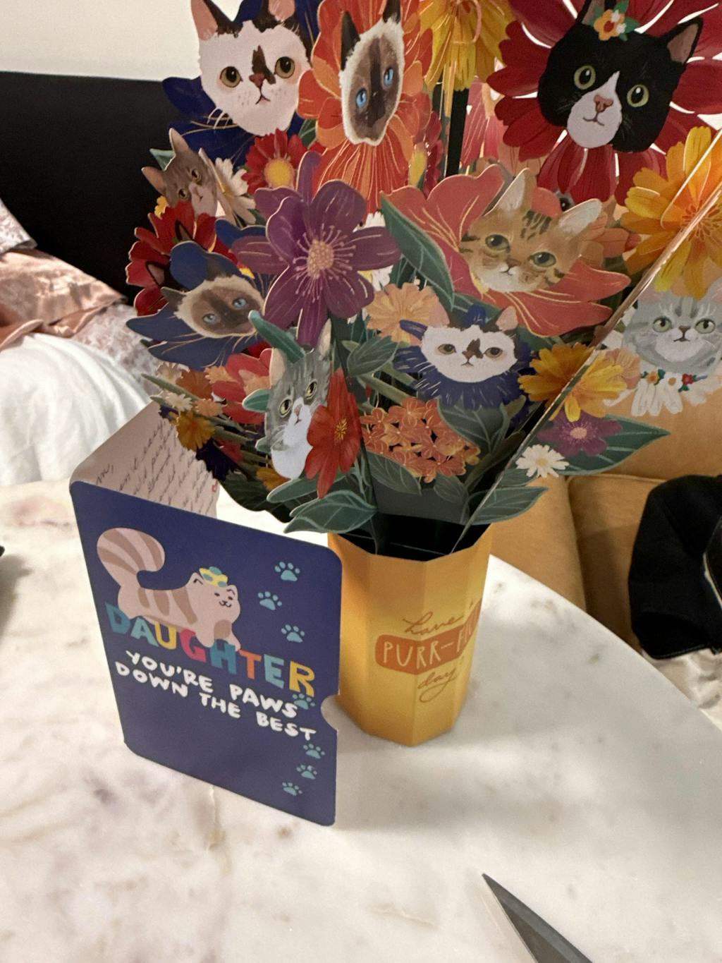 Paula Biancalana (Rohnert Park, US) I bought this bouquet for my daughter's birthday and she loved it!! She has two cats and both of them are portrayed on the card, it was excellent.