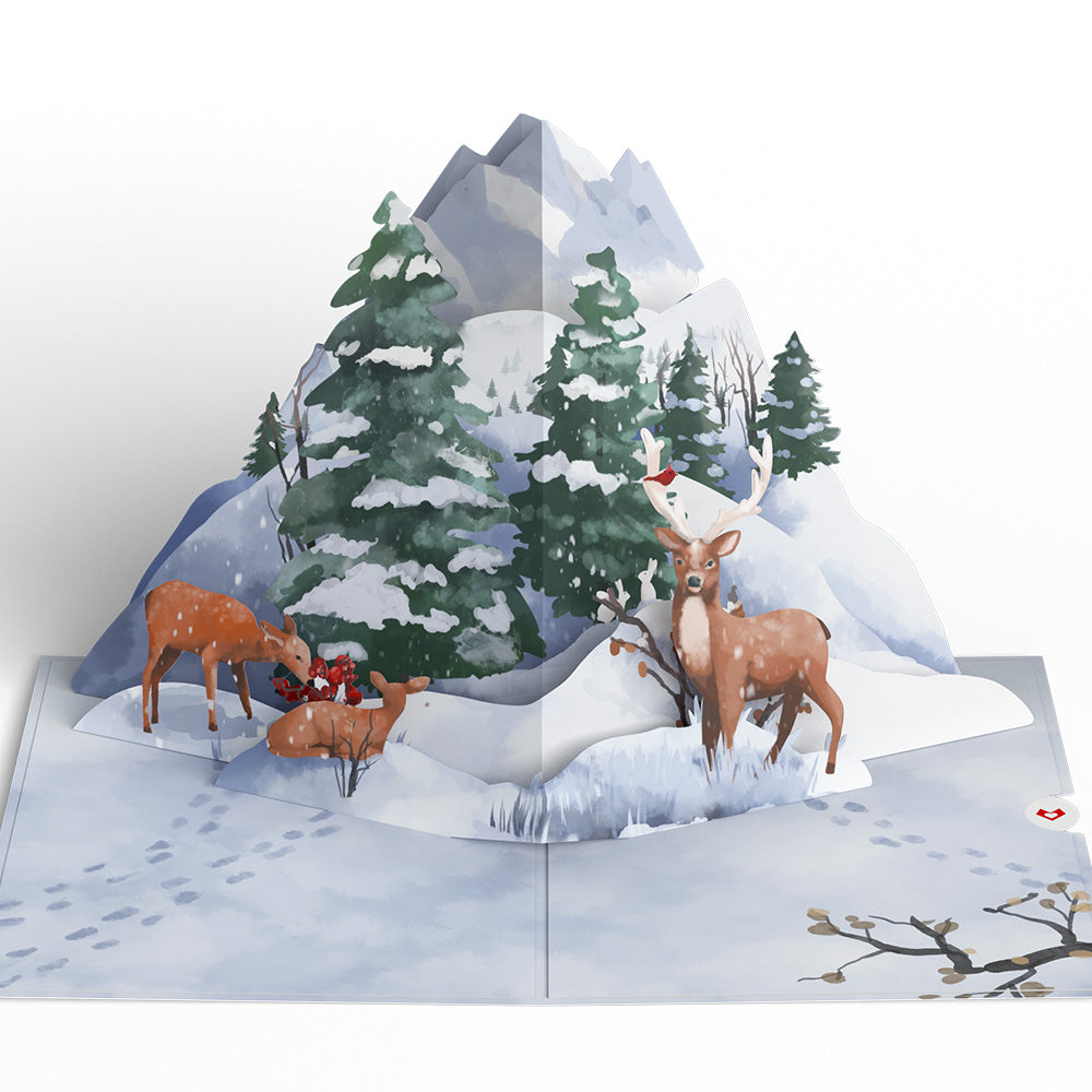 Description: Bring the beauty of winter wildlife to their mailbox with this stunning pop-up card. The elegant cover features a songbird perched on a branch of bright red berries, while inside, a serene snowy forest unfolds with a majestic stag, gentle deer, and snow-covered evergreens. This card is a breathtaking way to send holiday cheer, celebrate nature, or share a peaceful seasonal greeting.
