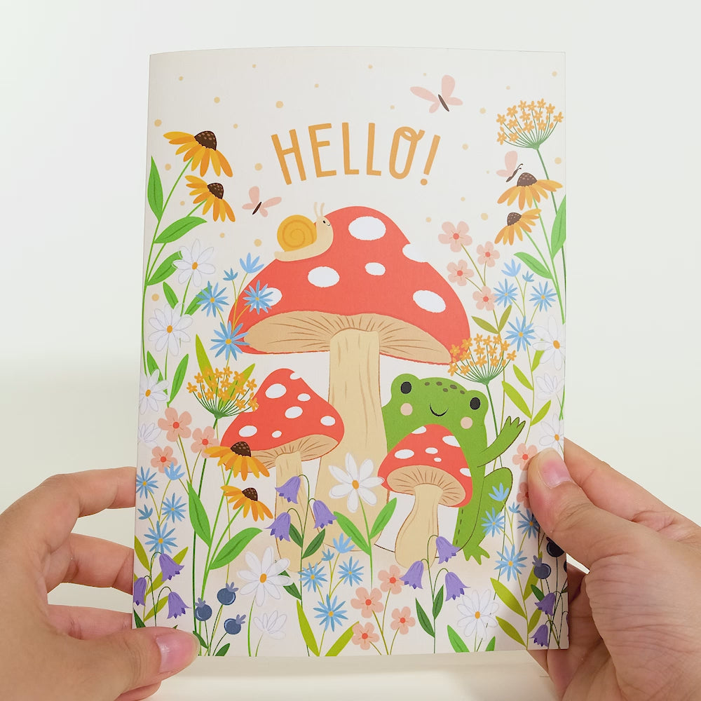 This adorable plush pop-up card is a cheerful burst of joy featuring a whimsical forest scene on the cover with mushrooms, wildflowers, and a happy little frog waving beneath the word “HELLO!” Inside, a soft, huggable plush frog pops up from a bright floral meadow with the uplifting message: "You are toadally awesome.” Perfect for kids, frog lovers, or anyone who needs a cute and cuddly pick-me-up