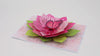 The cover of this sweet pop-up card features the message 'Happy Valentine's Day' in flashy pink writing. Four golden butterflies and little shimmering hearts decorate the space around the message. When you open the card, an incredible pop-up flower almost as large as the card itself springs to life atop a page sprinkled with more tiny gold hearts. The flower has an inner layer of light pink petals, an outer layer of deep pink petals, and a final layer of lush green leaves. In the center of the flower perches a hot pink butterfly with black monarch detailing.