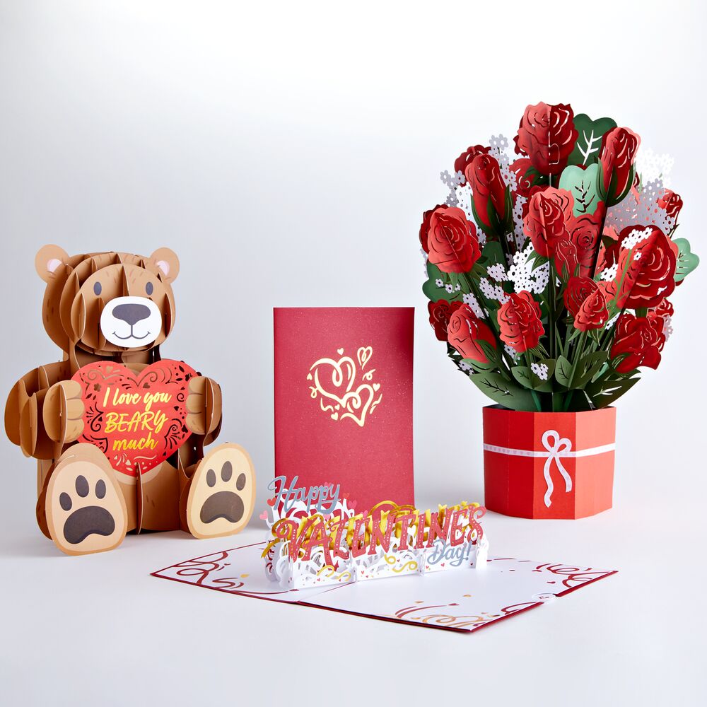 This bundle includes a pop-up card, bear, and bouquet. The card features gold hearts on a red cover. Inside, the message 'Happy Valentine's Day' folds out from the page in an explosion of two-dimensional confetti. The free-standing, pop-up bear sits, smiling, with a red heart in its hands. The heart has intricate cut-out detailing and the message 'I love you beary much' in cheerful yellow script. Finally, the elegant paper flower bouquet bursts with sophisticated red roses, delicate white baby's breath, and emerald green leaves, all emerging from a red paper vase tied with a white ribbon.