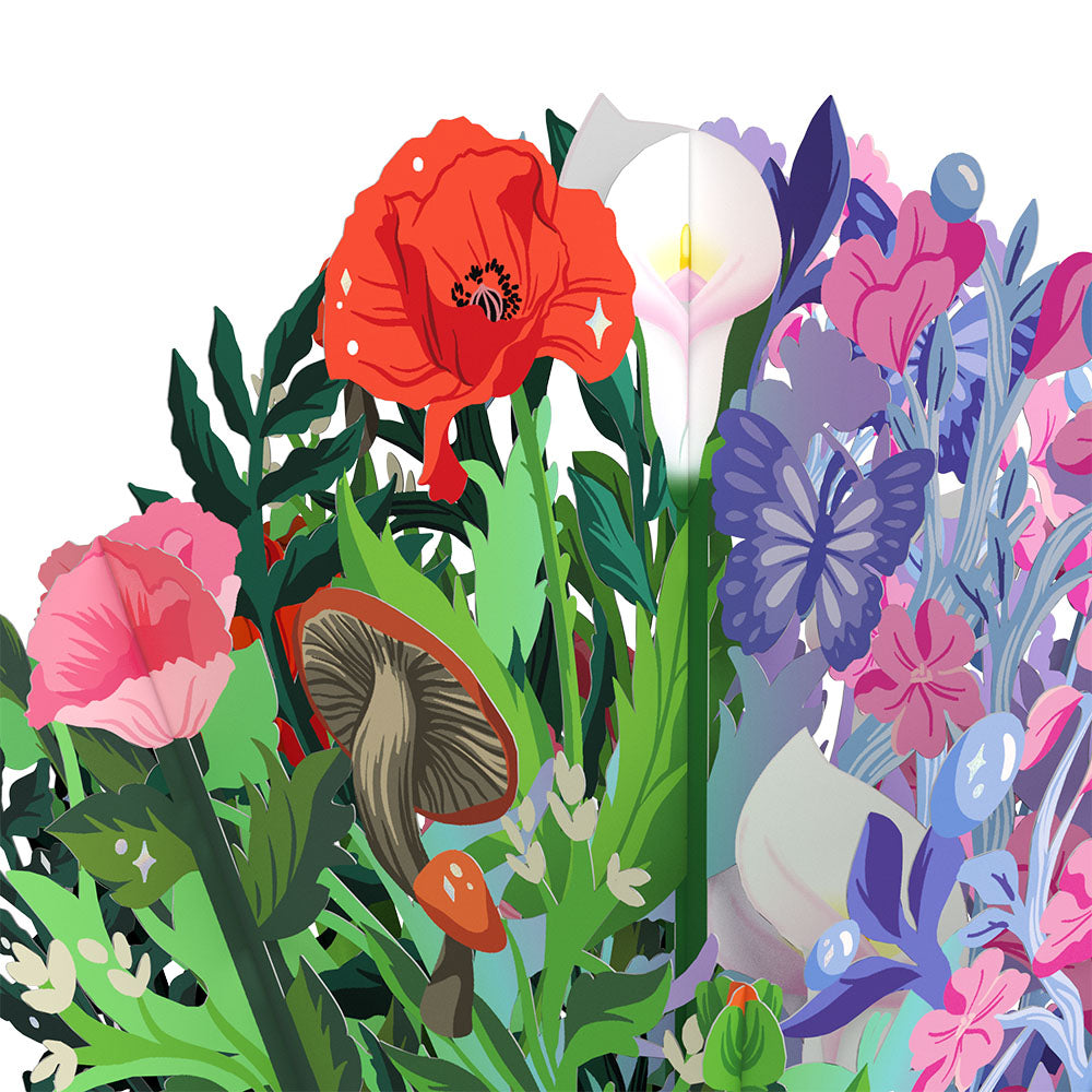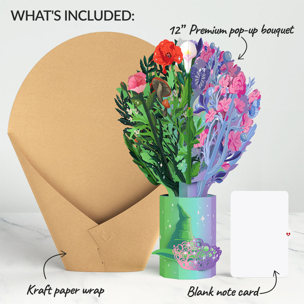 This enchanting pop-up bouquet, inspired by Wicked, beautifully blends two worlds in one arrangement. One side features rich greens, vibrant poppies, and earthy mushrooms, while the other bursts with soft purples, pinks, and delicate butterflies. The base displays a shimmering gradient adorned with Elphaba's iconic hat and Glinda’s sparkling crown, symbolizing the unique friendship between Elphaba and Glinda. A stunning keepsake for theater lovers and fans of the beloved movie.